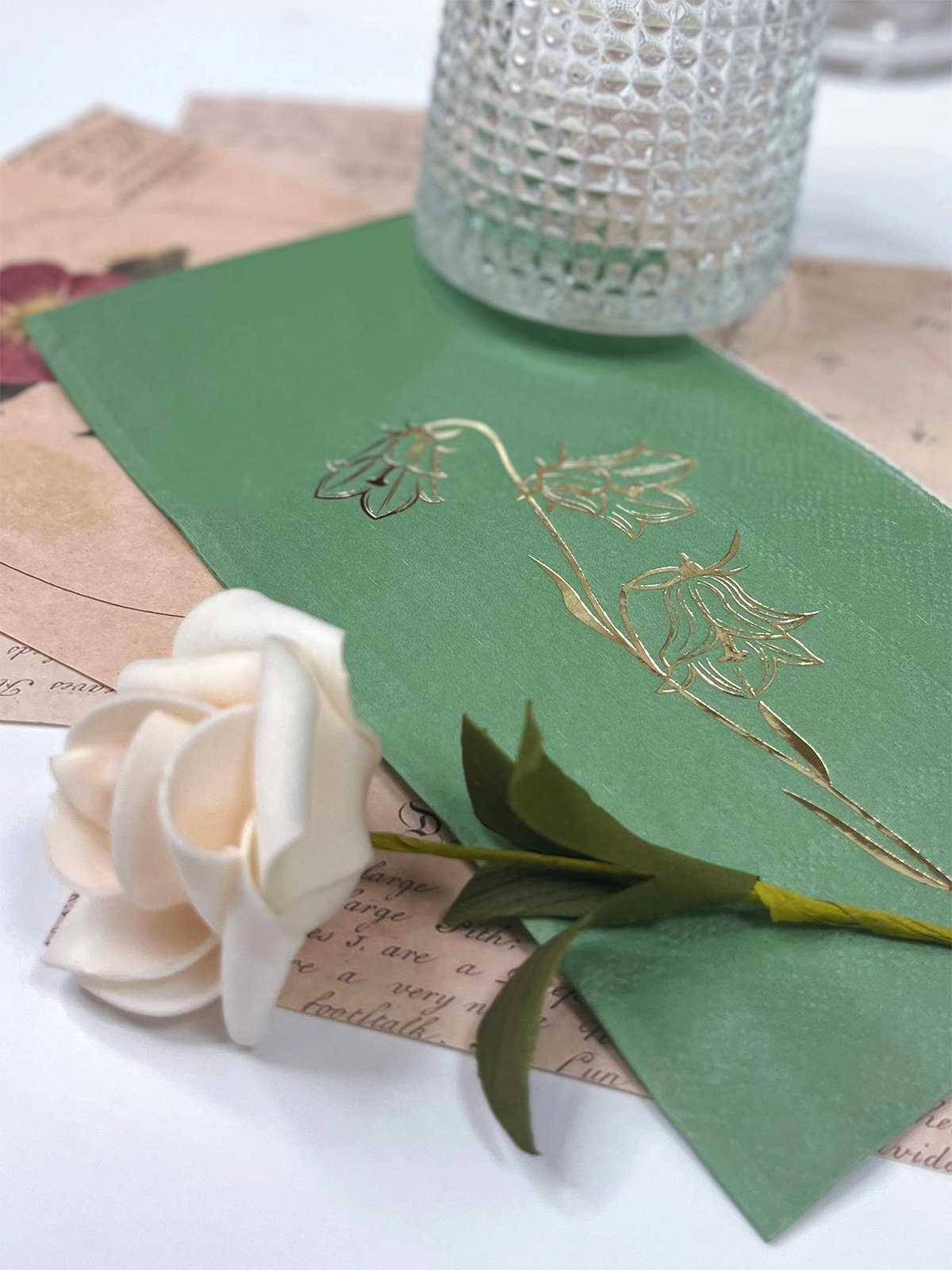 계곡의 금박 백합 게스트 냅킨은 녹색과 짙은 녹색 배경에 복잡한 꽃무늬 디자인이 특징입니다. 결혼식, 저녁 식사, 욕실 등에 적합한 매력적이고 우아한 파티 장식입니다.