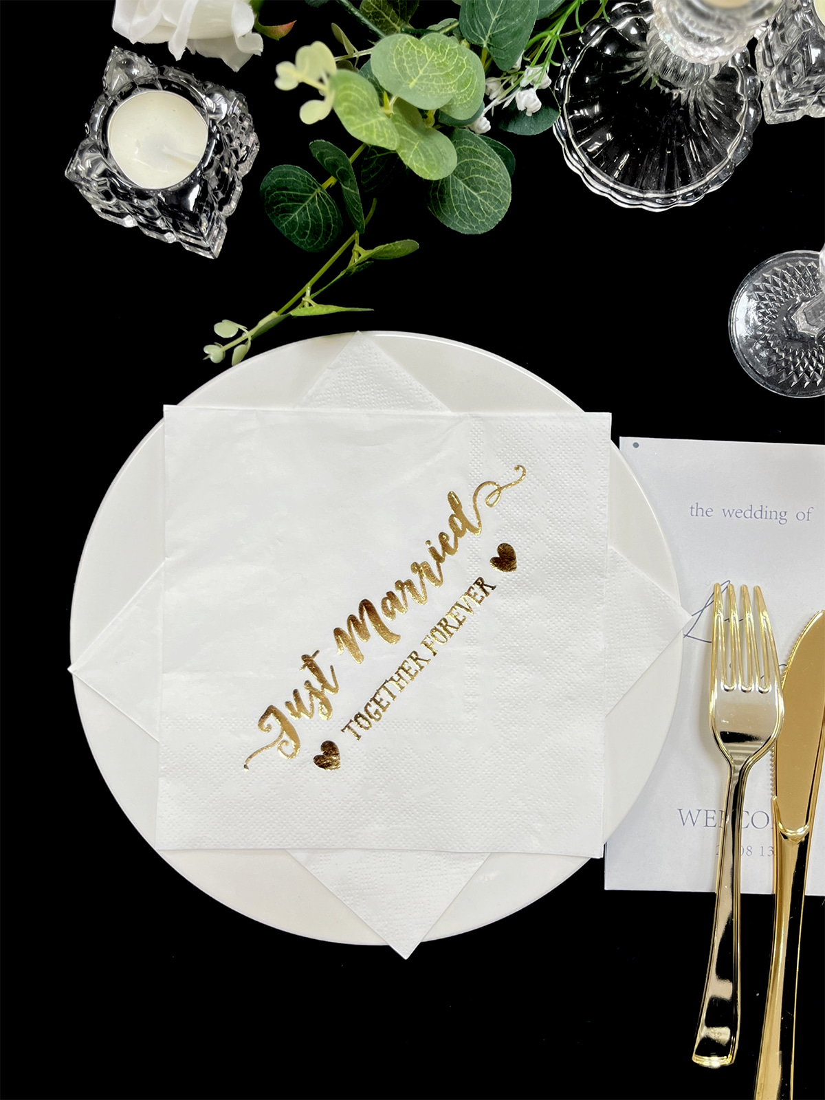 흰 종이에 금박으로 장식한 심플하면서도 우아한 디자인이 특징인 오찬 냅킨은 식기의 매력을 돋보이게 하고 매력적인 파티 분위기를 연출합니다.